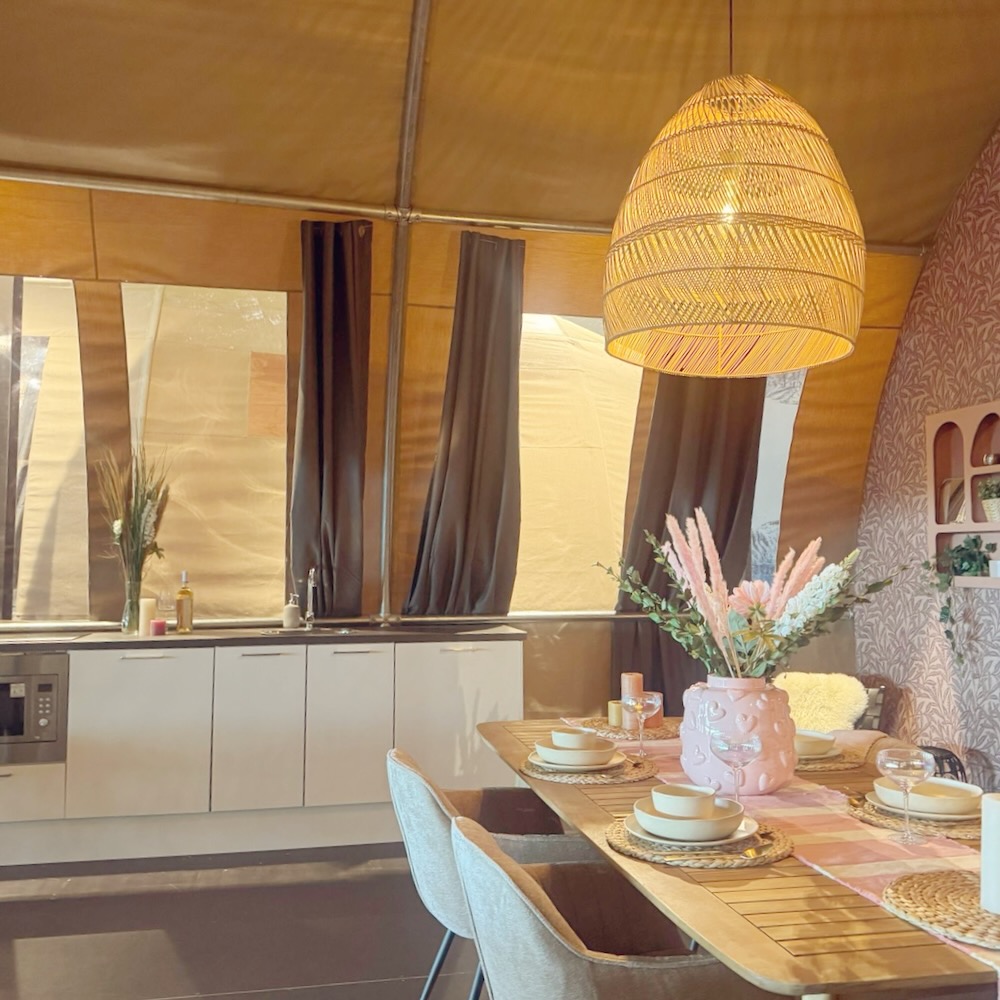 Heb je geen eigen kampeermiddel of laat je deze liever een keer thuis? In de comfortabele glampingtenten, geschikt voor 6 personen, ben je van alle gemakken voorzien. Van een badkamer met regendouche tot een compleet ingerichte keuken: aan alles is gedacht.